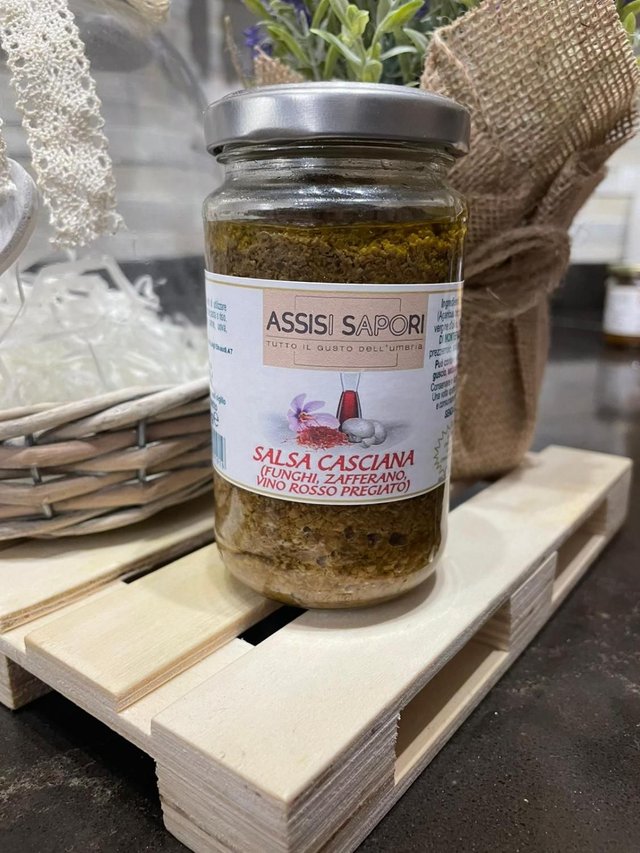 Salsa a base di funghi, zafferano e Sagrantino di Montefalco; perfetta per condire primi piatti, bruschette o uova.